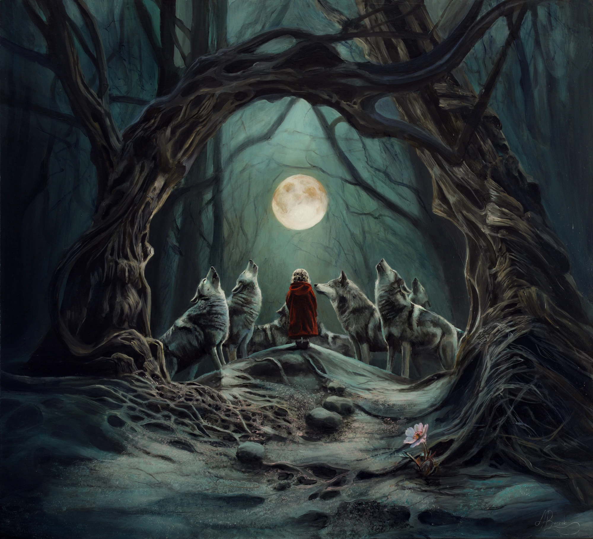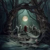 Among the wolves stands a girl in a red cloak — a clear reference to the archetype of Little Red Riding Hood. Yet in this story she is neither helpless nor lost. The wolves howl at the moon, participating in an ancient, almost ritualistic act that emphasizes wildness, instinct, and the primordial order of the world. Their presence does not suggest danger but creates an aura of unity and protection — the girl becomes part of nature rather than its victim.
